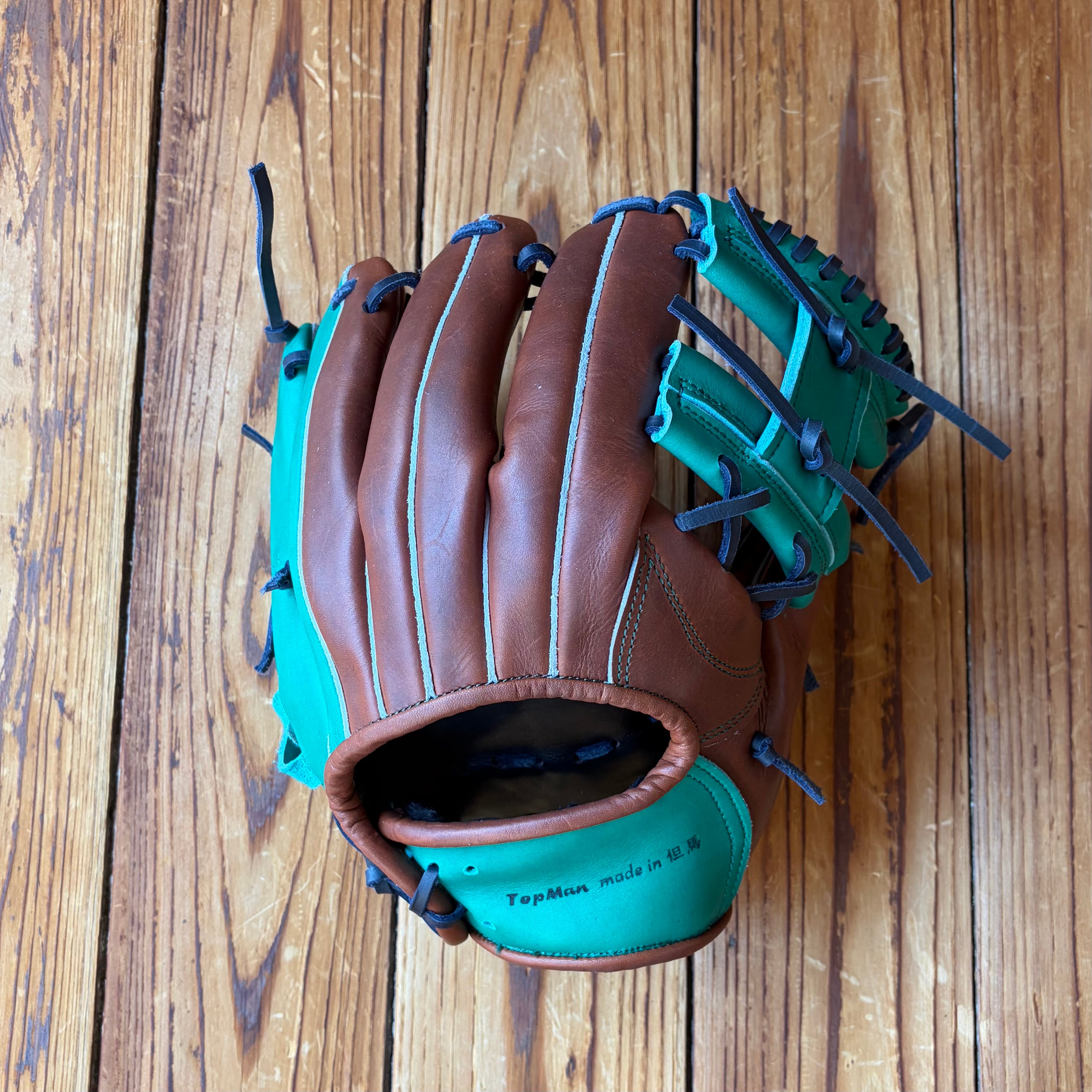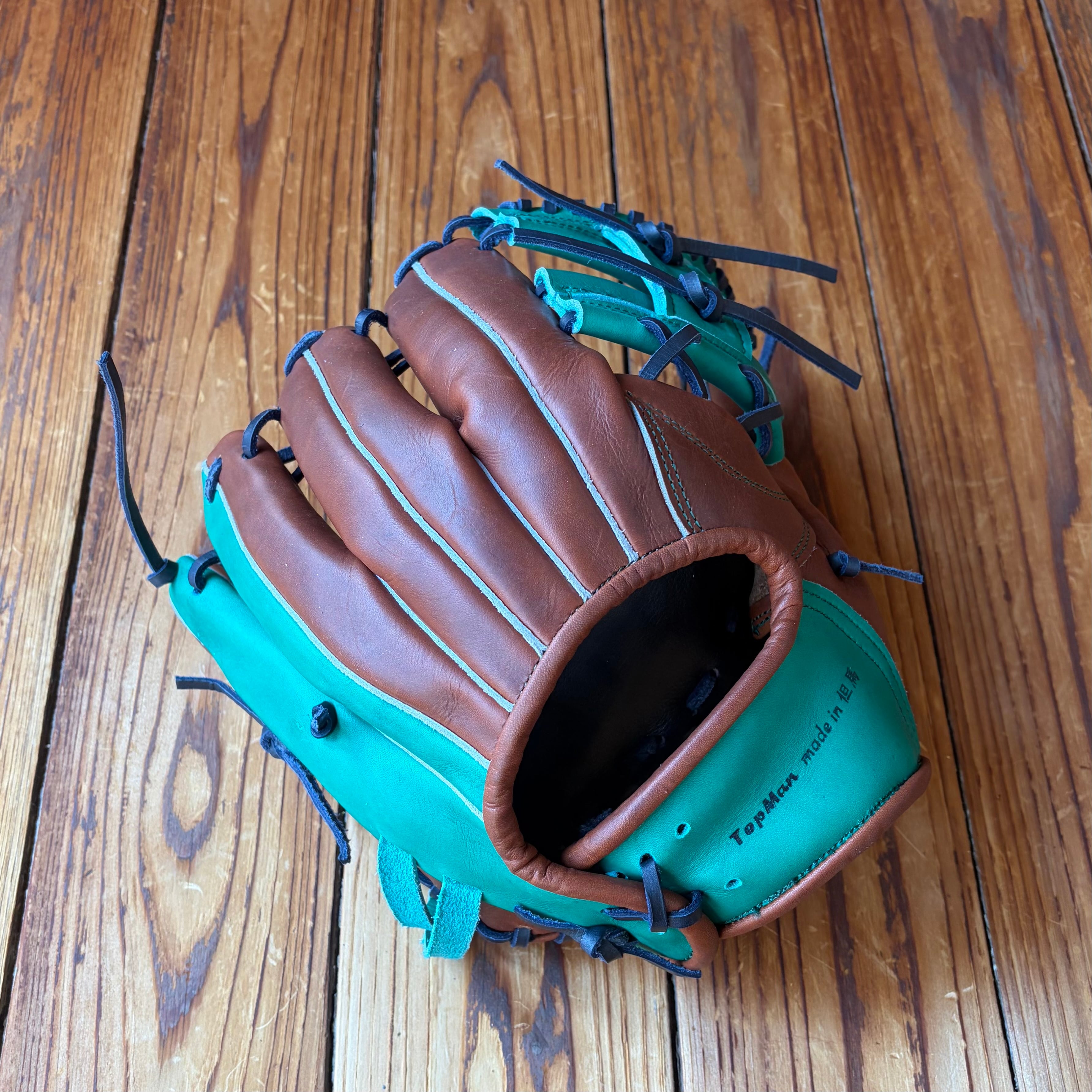 ラベルがなく、バンド部と捕球面にTOPMANの刻印をした、シンプルデザインです。